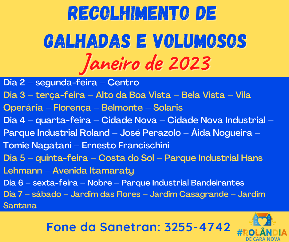 AGENDA DE JANEIRO DE 2023 PARA RECOLHER GALHADAS E VOLUMOSOS A secretaria de Agricultura e Meio Ambiente informa que a empresa terceirizada que presta serviço ao município, a SANETRAN, dividiu a cidade em 14 regiões, sendo doze setores na área ur...