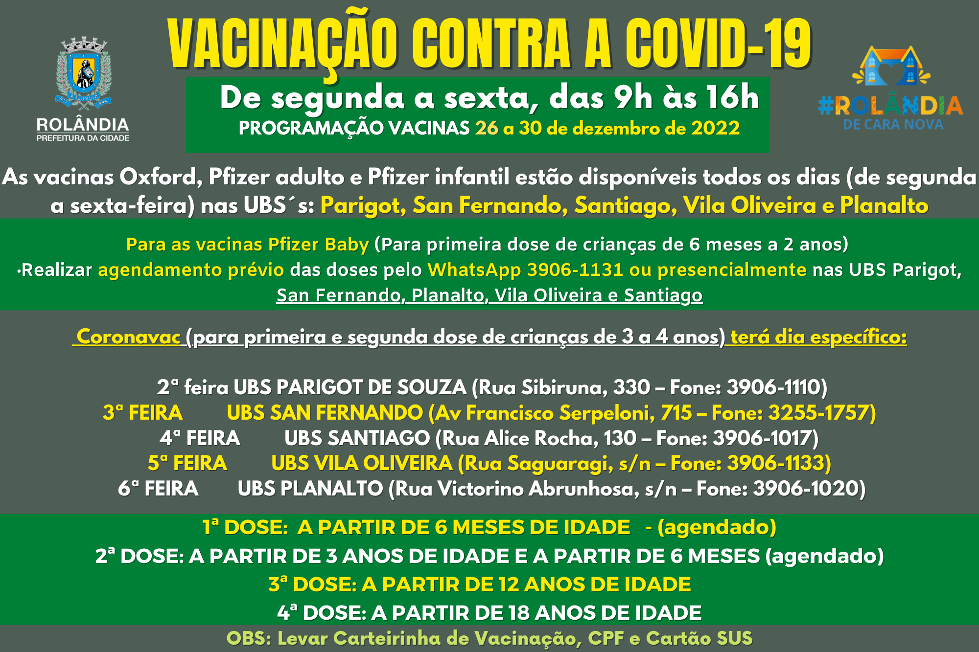 PROGRAMAÇÃO VACINAS CONTRA A COVID-1926 a 30 de dezembro de 2022A secretaria de Saúde informa:As vacinas Oxford, Pfizer adulto e Pfizer infantil estarão disponíveis todos os dias (de segunda a sexta-feira) nas UBS´s: Parigot, San Fernando, Sant...