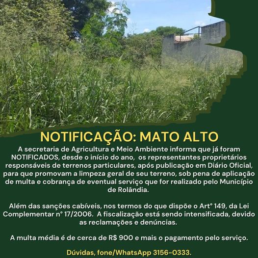 NOTIFICAÇÃO MATO ALTOA secretaria de Agricultura e Meio Ambiente informa que já foram NOTIFICADOS, desde o início do ano, os representantes proprietários responsáveis de terrenos particulares, após publicação em Diário Oficial, para que pro...
