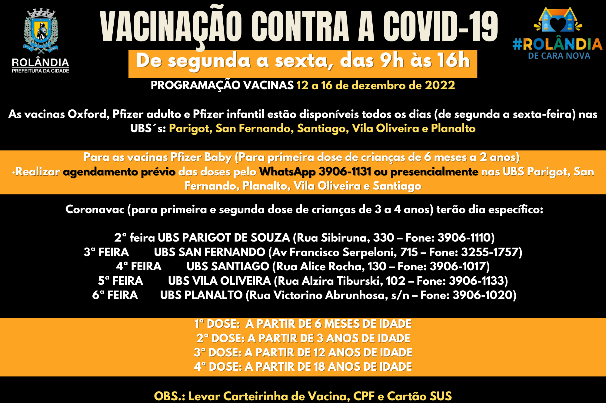 PROGRAMAÇÃO SEMANALVACINAS COVID-1912 a 16 de dezembro de 2022 As vacinas Oxford, Pfizer adulto e Pfizer infantil estarão disponíveis todos os dias (de segunda a sexta-feira) nas UBS´s: Parigot, San Fernando, Santiago, Vila Oliveira e Planalt...