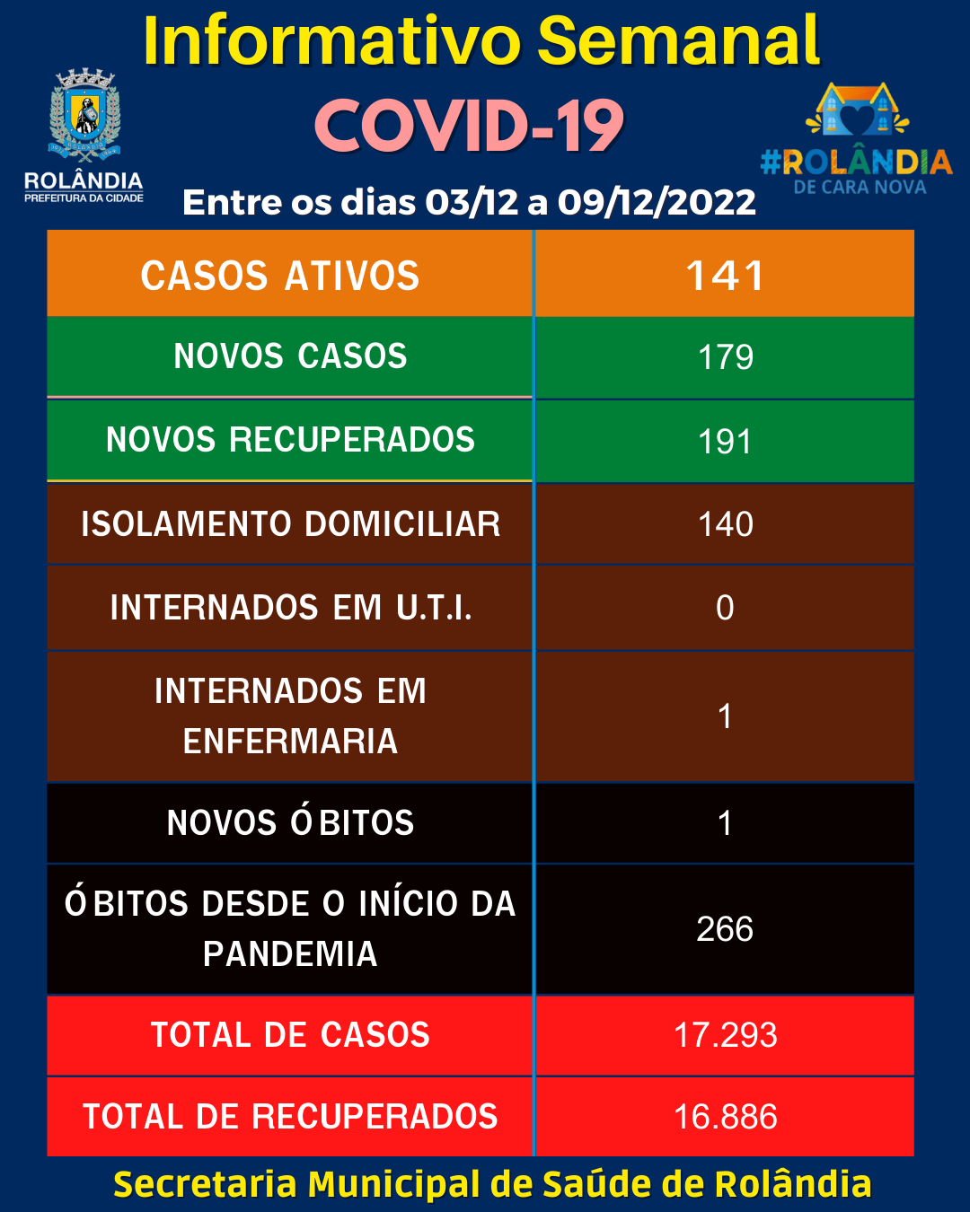 BOLETIM COVID-19A secretaria municipal de Saúde informa sobre os casos de covid-19, entre os dias 03/12 a 09/12 de 2022. Na atualização do boletim, 179 contaminações e 191 pacientes curados. Rolândia tem 141 pacientes com covid-19, sendo 14...