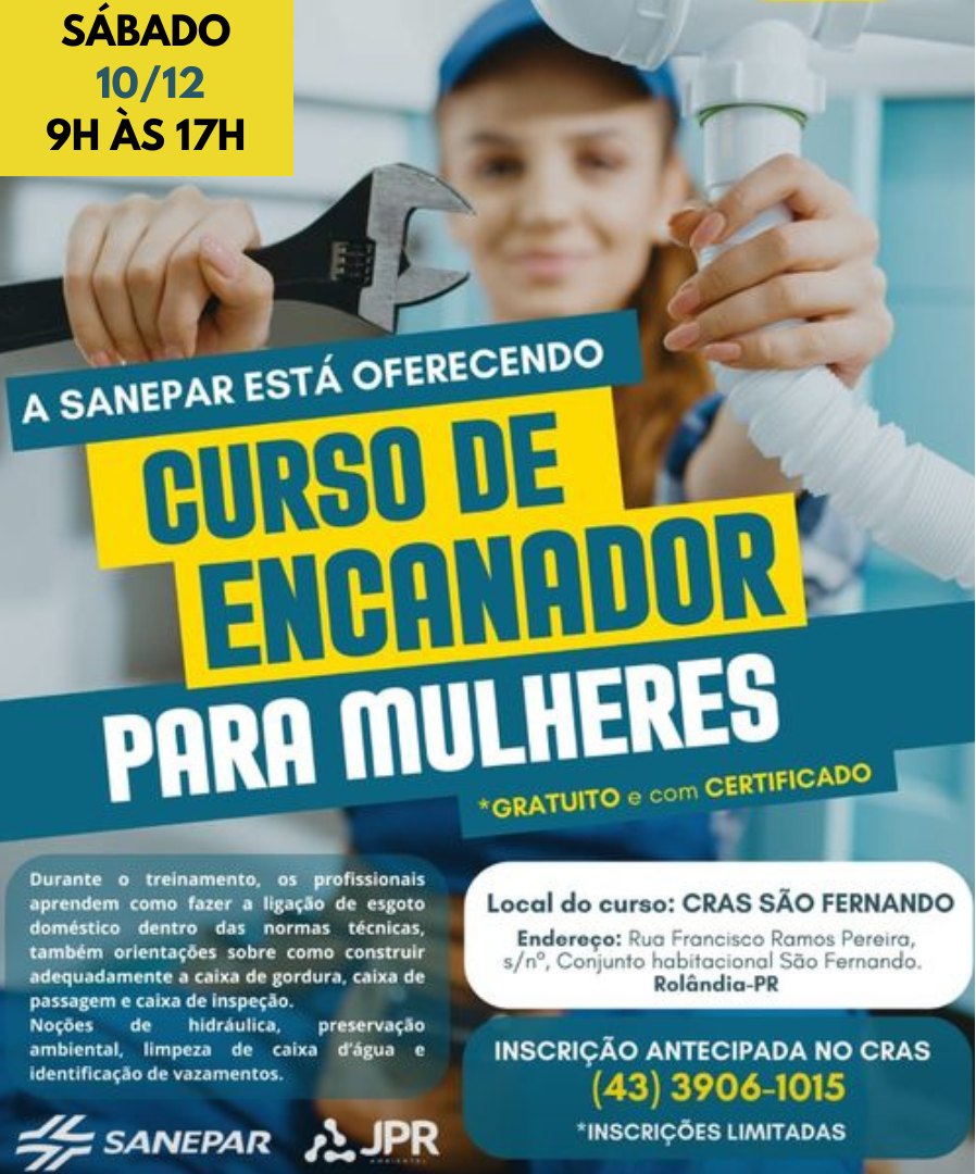 AINDA HÁ VAGASCurso de Manutenção Hidráulica em RolândiaData: 10 de dezembro, sábadoHorário: das 9h às 17hLocal: CRAS San Fernando - Rua Francisco Ramos Pereira, s/nJardim San Fernando - Rolândia/PRInscrições: no CRAS ou pelo telefone (43...