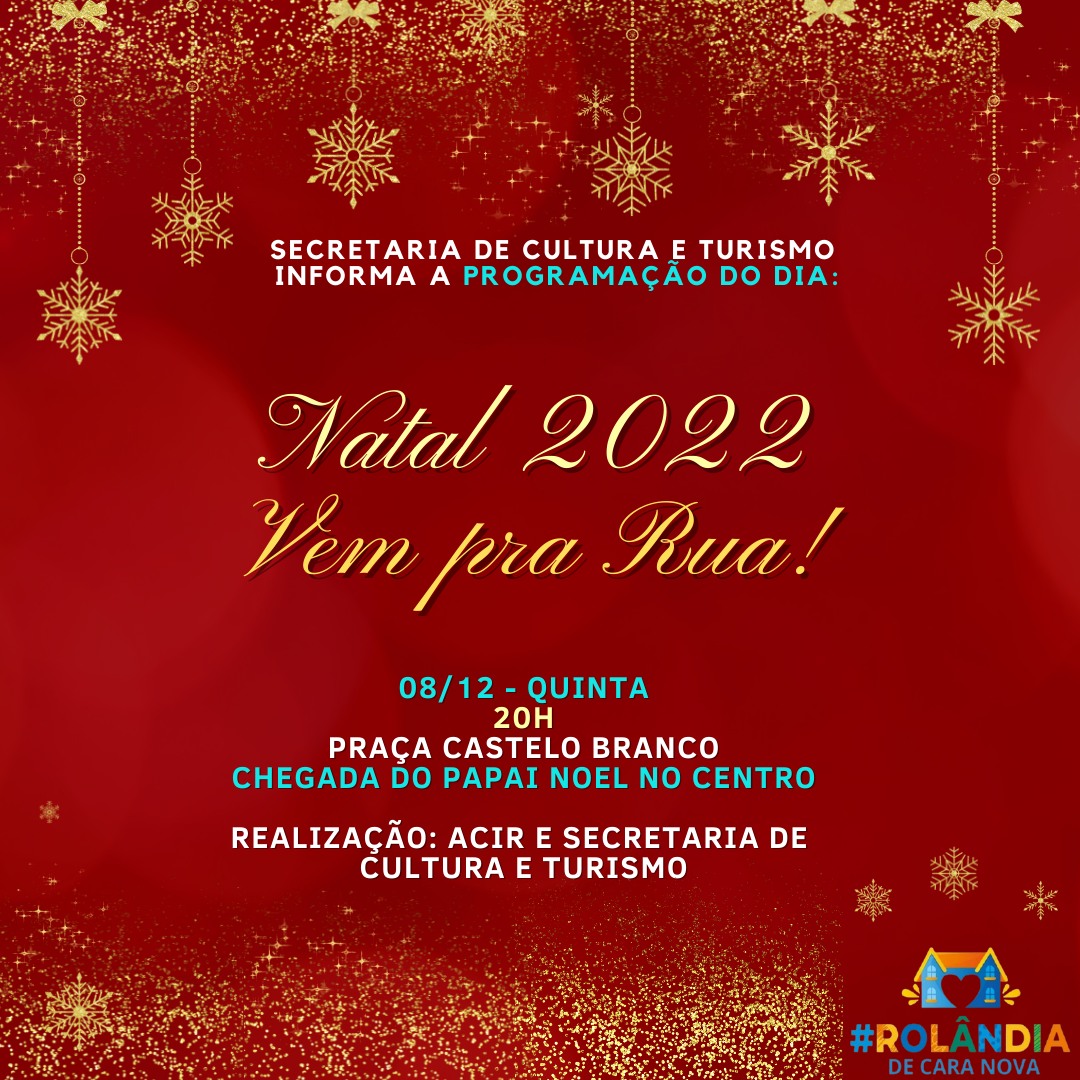 PROGRAMAÇÃO DO DIANATAL 2022VEM PRA RUA!A programação cultural e artística da cidade, alusiva ao Natal 2022, está repleta de atrações.O trabalho é uma parceria da Prefeitura, por meio de suas secretarias, com a Associação Comercial (ACIR),...
