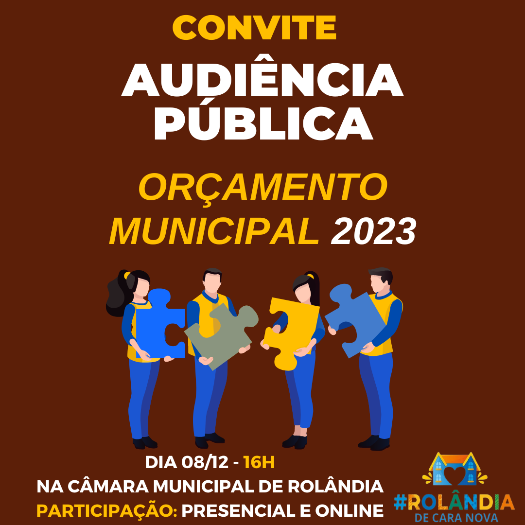 CONVITE AUDIÊNCIA PÚBLICA: ORÇAMENTO MUNICIPAL 2023A secretaria de Finanças e a Câmara Municipal de Rolândia, por meio da Comissão de Orçamento, Tributação e Finanças, convidam toda a população para a Audiência Pública do Projeto de Le...