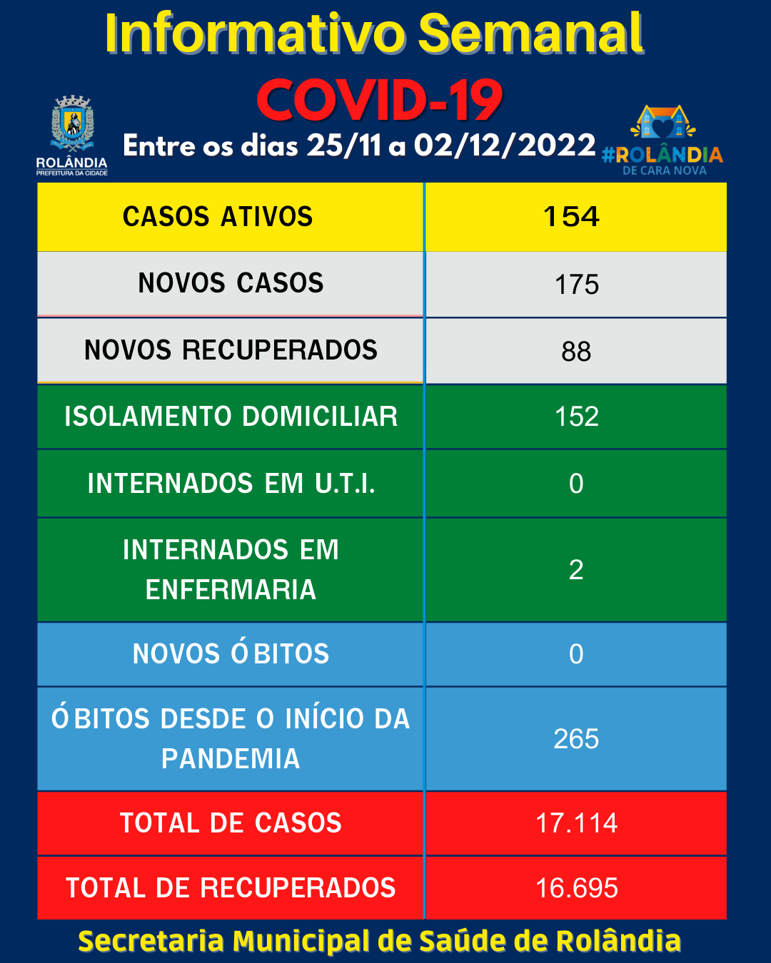 BOLETIM COVID-19A secretaria municipal de Saúde informa sobre os casos de covid-19, entre os dias 25/11 a 02/12 de 2022. Na atualização do boletim, 175 contaminações e 88 pacientes curados. Rolândia tem 154 pacientes com covid-19, sendo 152 em...