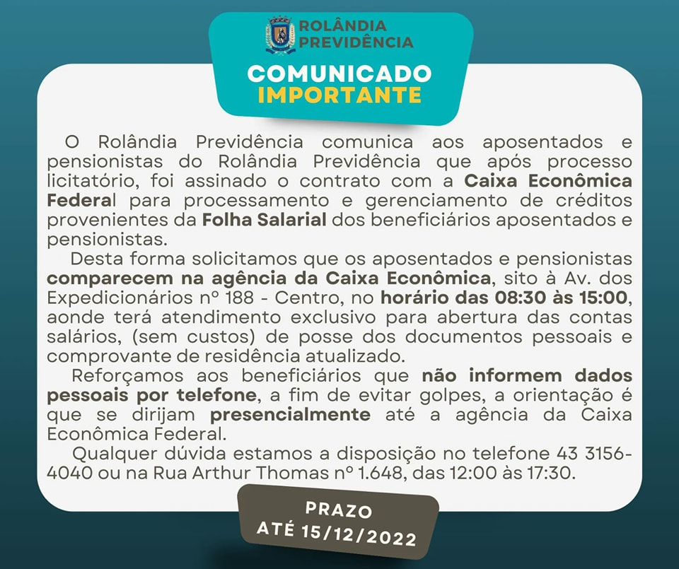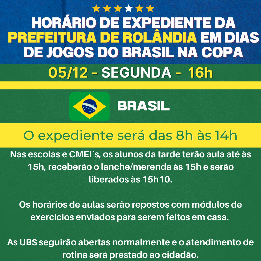 JOGO DO BRASIL NA COPA DO MUNDO ALTERA HORÁRIO DE EXPEDIENTE DA PREFEITURA DE ROLÂNDIA Por meio do Decreto Municipal 477, a Prefeitura de Rolândia faz adequações em seus horários de atendimento ao público devido aos jogos da Copa do Mundo Fifa...