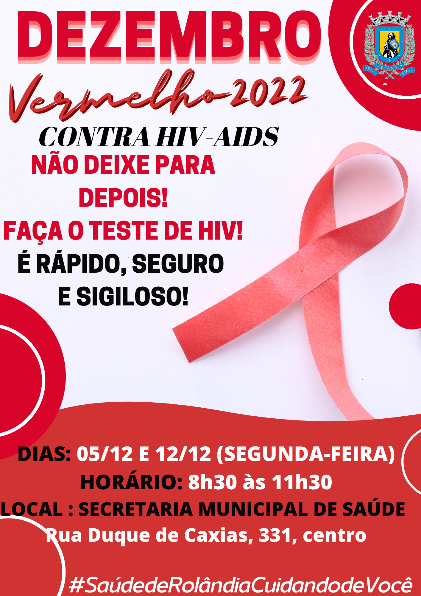 FAÇA O TESTE GRATUITO DE HIV, NAS DUAS PRÓXIMAS SEGUNDAS-FEIRAS! As ações do Dezembro Vermelho, da Secretaria de Saúde, tem como objetivo a conscientização da luta contra a HIV/Aids e outras ISTs (Infecções Sexualmente Transmissíveis), par...