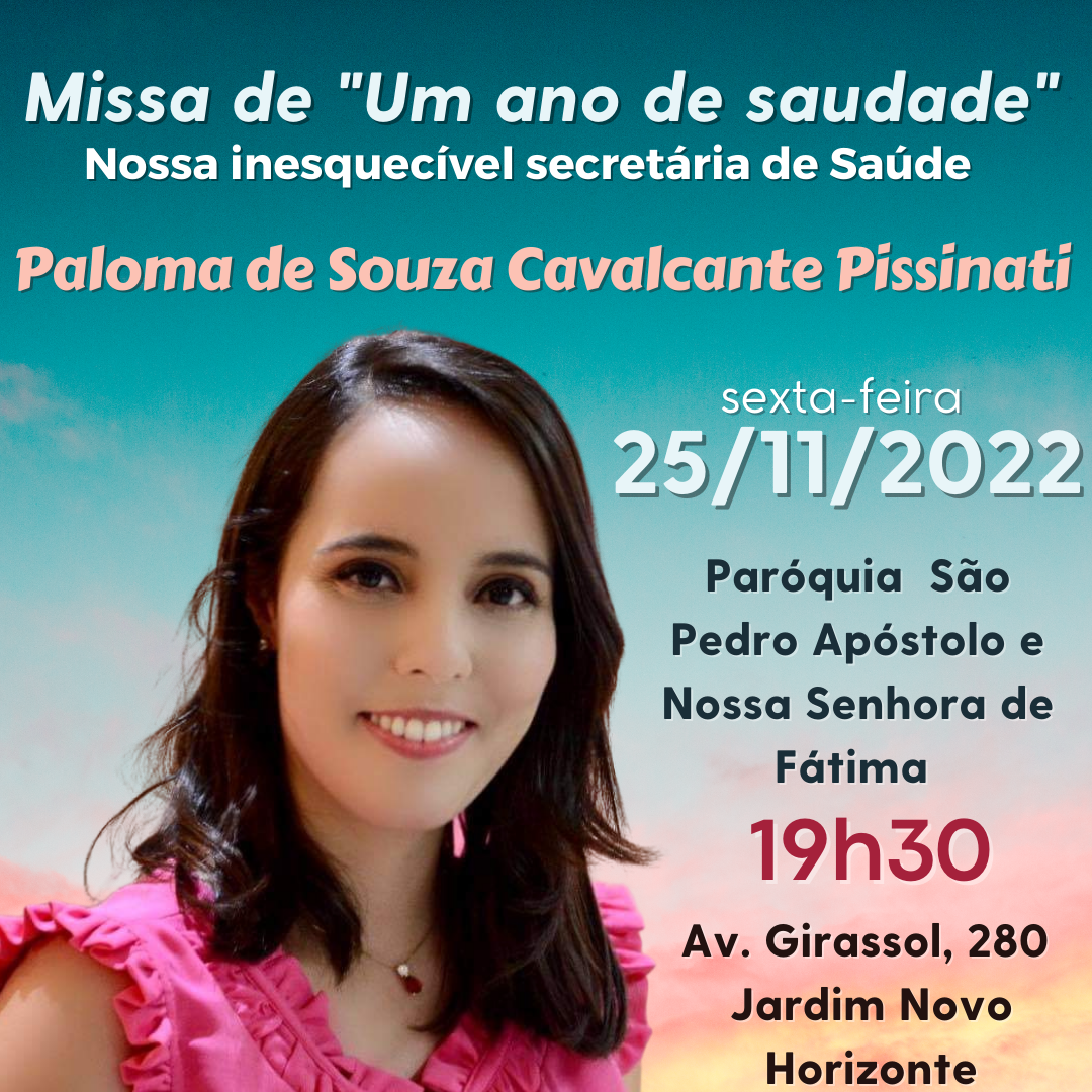 CONVITE: MISSA "UM ANO DE SAUDADE"O prefeito de Rolândia, Ailton Maistro, convida para a Missa "Um ano de saudade", em memória da inesquecível secretária de Saúde, Paloma Pissinati. A celebração vai acontecer nesta sexta-feira, dia 25 de nove...