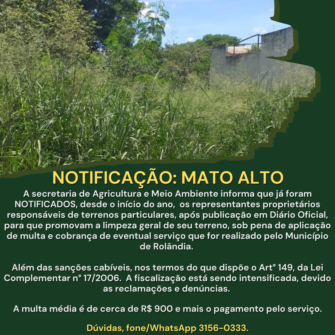 NOTIFICAÇÃO MATO ALTOA secretaria de Agricultura eMeio Ambiente informa que já foram NOTIFICADOS, desde o início do ano, os representantes proprietários responsáveis de terrenos particulares, após publicação em Diário Oficial, para que pr...