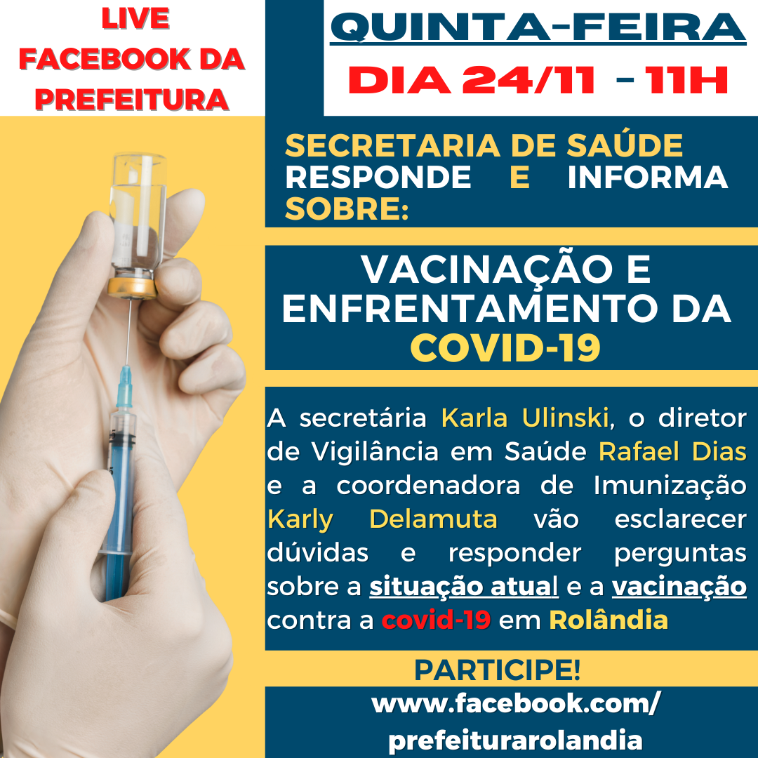 Tem alguma dúvida sobre a vacinação contra a covid-19?Quer saber sobre a situação da doença na cidade?Quinta, dia 24, 11h, a secretaria de Saúde vai responder essas e outras dúvidas da população!Participe!...