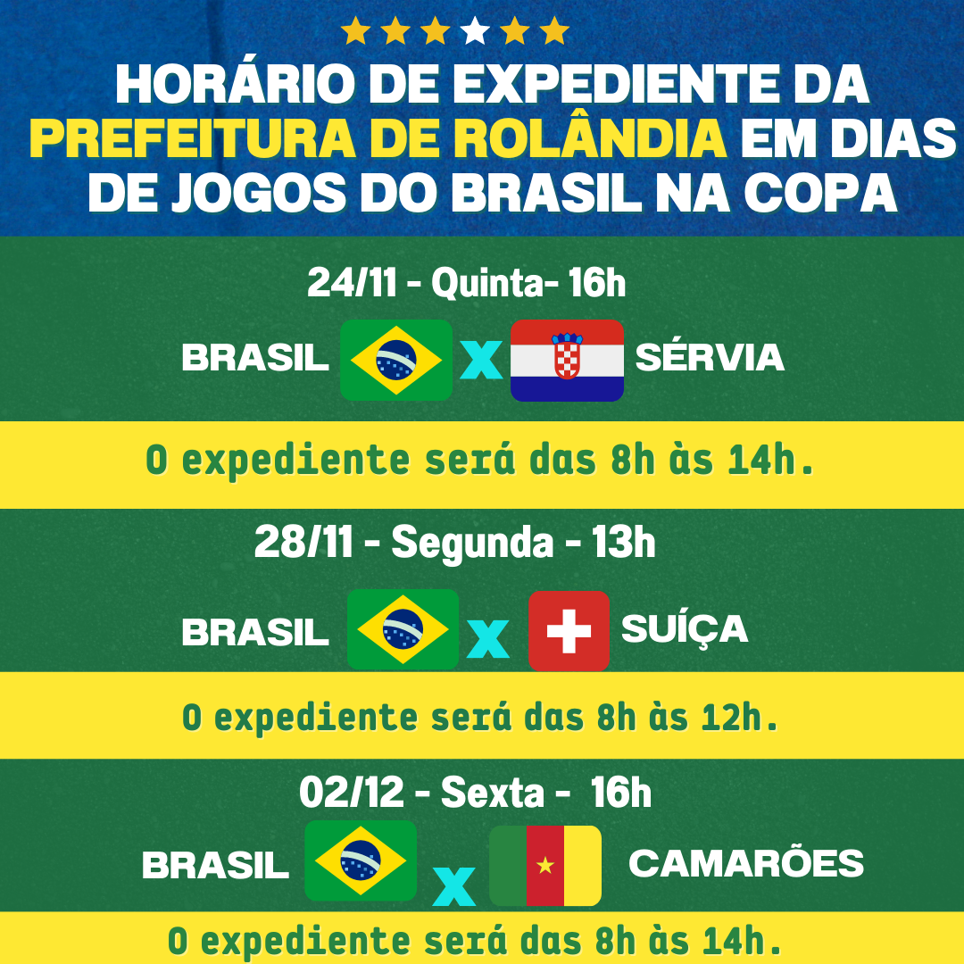 DEVIDO AOS JOGOS DO BRASIL NA COPA DO MUNDO, PREFEITURA ALTERA HORÁRIO DE EXPEDIENTEPor meio do Decreto Municipal 477, a Prefeitura de Rolândia faz adequações em seus horários de atendimento ao público devido aos jogos da Copa do Mundo Fifa 202...