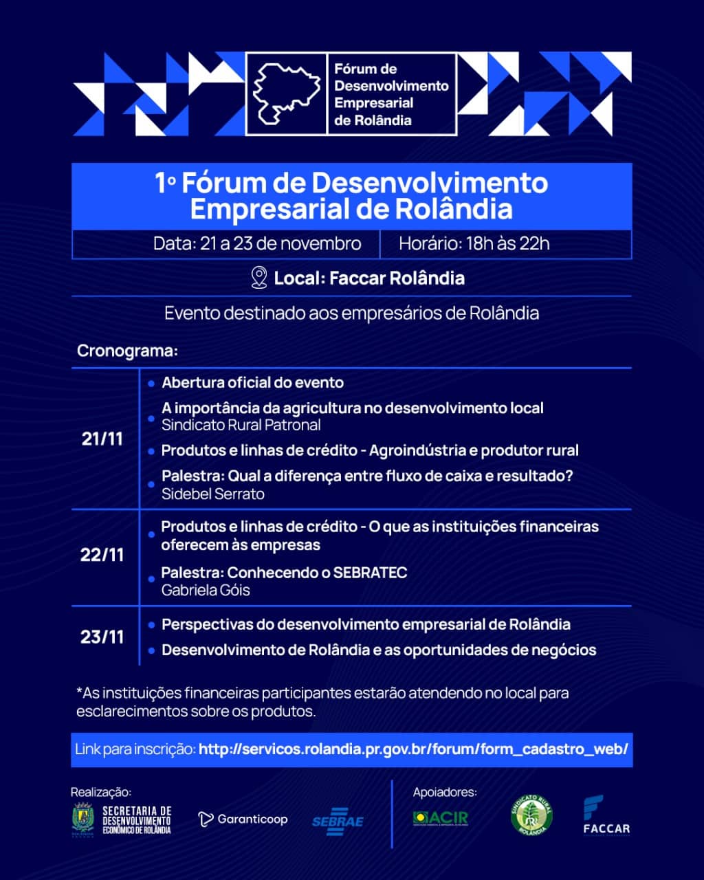 "1º FÓRUM DE DESENVOLVIMENTO EMPRESARIAL DE ROLÂNDIA" COMEÇA COM EXTENSA PROGRAMAÇÃOA secretaria de Desenvolvimento Econômico, em parceria com a GarantiCoop e o Sebrae, convidam você para um evento gratuito, mas muito rico em conhecimento, po...