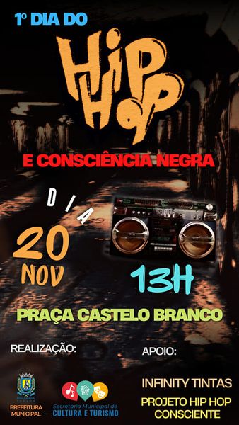 1° DIA DO HIP HOP E DA CONSCIÊNCIA NEGRANeste domingo, dia 20, a partir das 13h, na praça Castelo Branco, centro, a secretaria de Cultura e Turismo, com apoio da Infinity Tintas e o projeto Hip Hop Consciente, promovem o "1° Dia do Hip Hop e da C...
