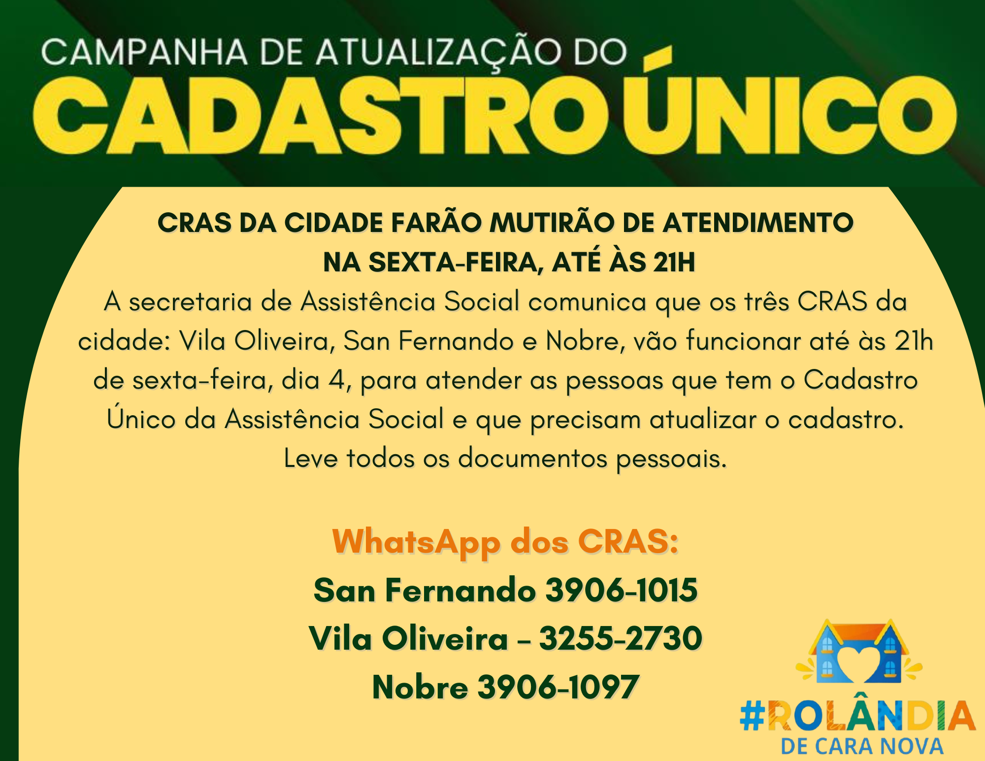CRAS DA CIDADE FARÃO MUTIRÃO DE ATENDIMENTO NA SEXTA-FEIRA, ATÉ ÀS 21HA secretaria de Assistência Social comunica que os três CRAS da cidade: Vila Oliveira, San Fernando e Nobre, vão funcionar até às 21h de sexta-feira, dia 4, para atender a...