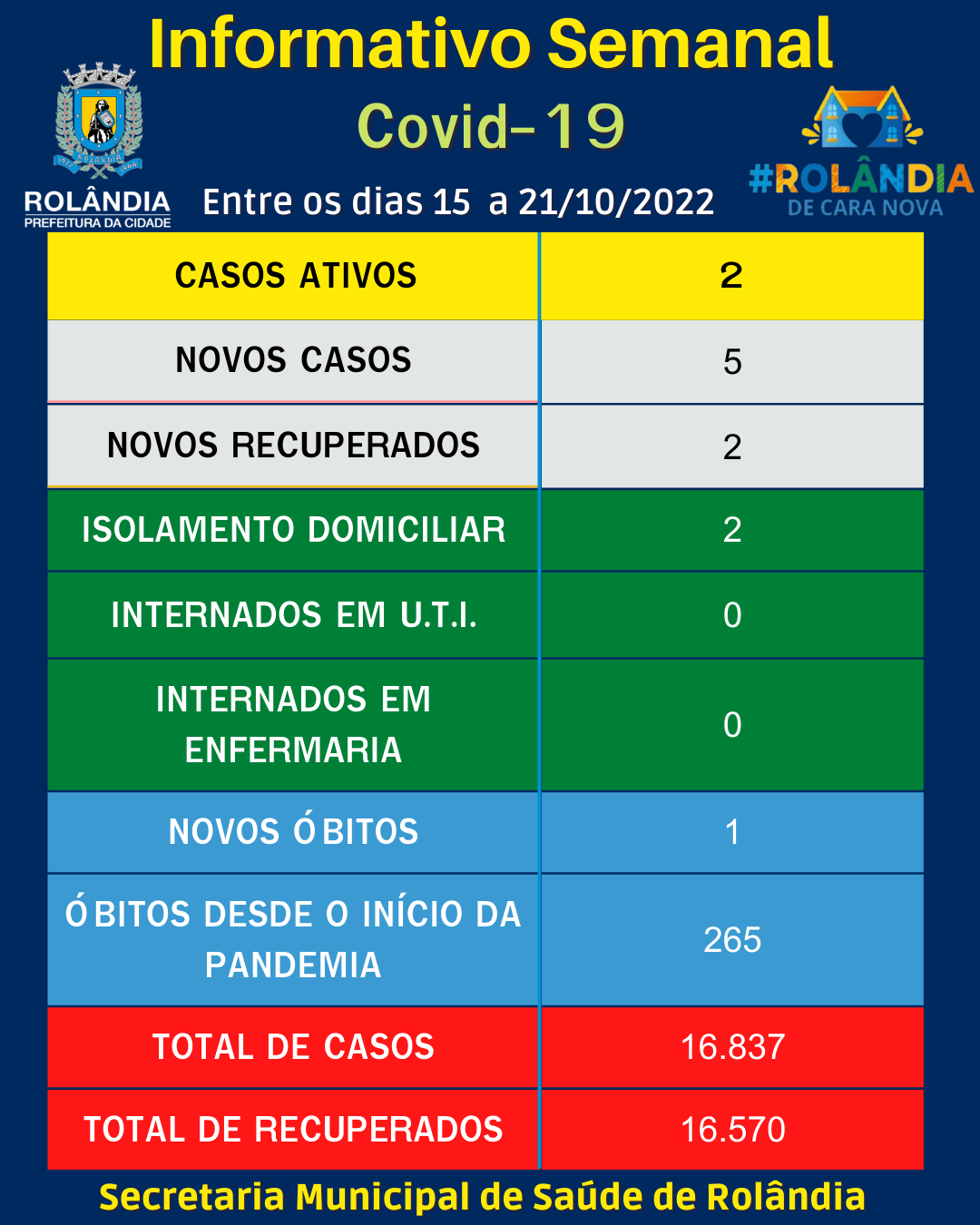 BOLETIM COVID-19A secretaria municipal de Saúde informa sobre os casos de covid-19, entre os dias 15 a 21 de outubro de 2022. Na atualização do boletim, cinco contaminações e dois pacientes curados. Rolândia tem atualmente dois pacientes com ...