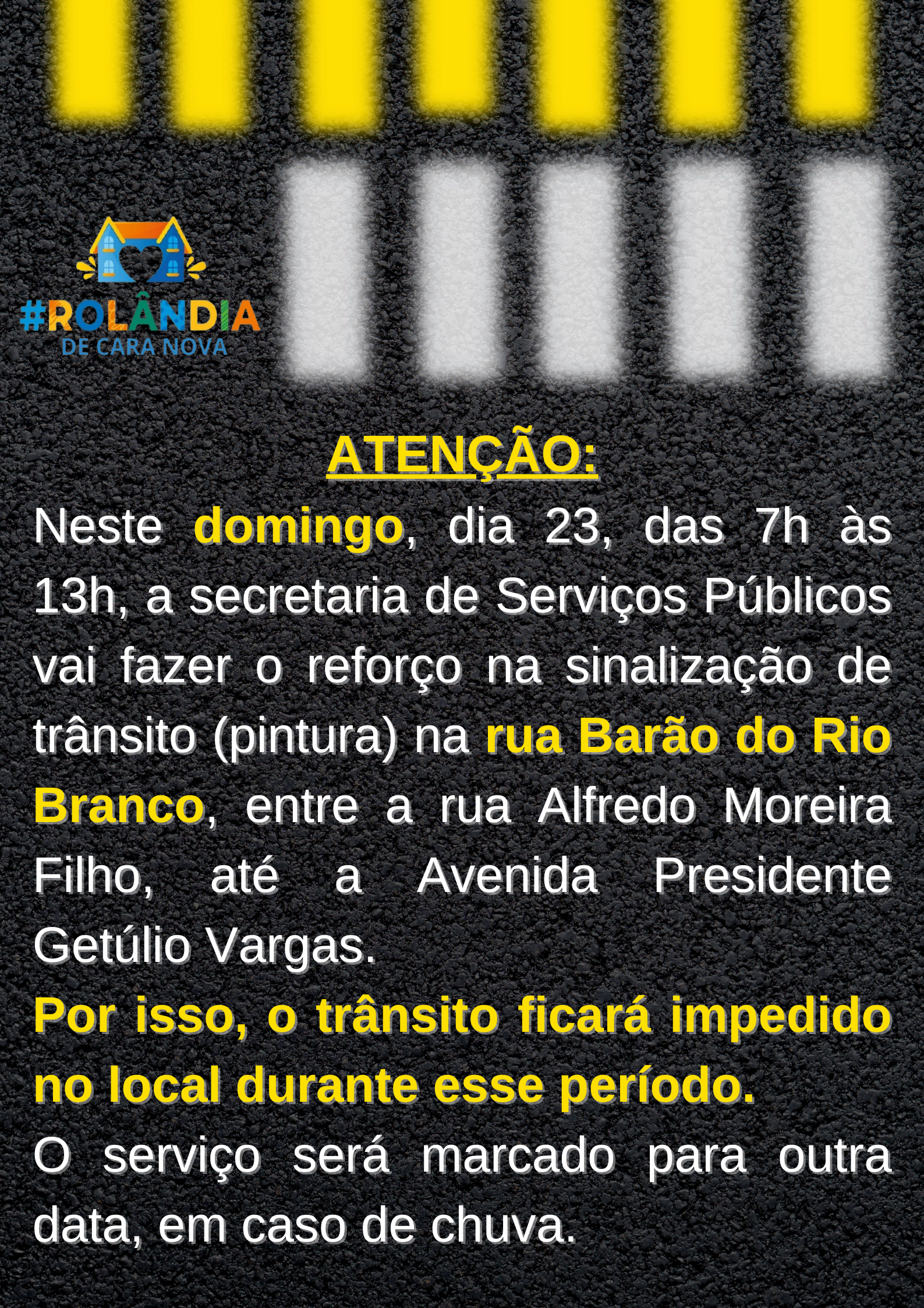 ATENÇÃO:Neste domingo, dia 23, das 7h às 13h, a secretaria de Serviços Públicos vai fazer o reforço na sinalização de trânsito (pintura) na rua Barão do Rio Branco, entre a rua Alfredo Moreira Filho, até a Avenida Presidente Getúlio Var...