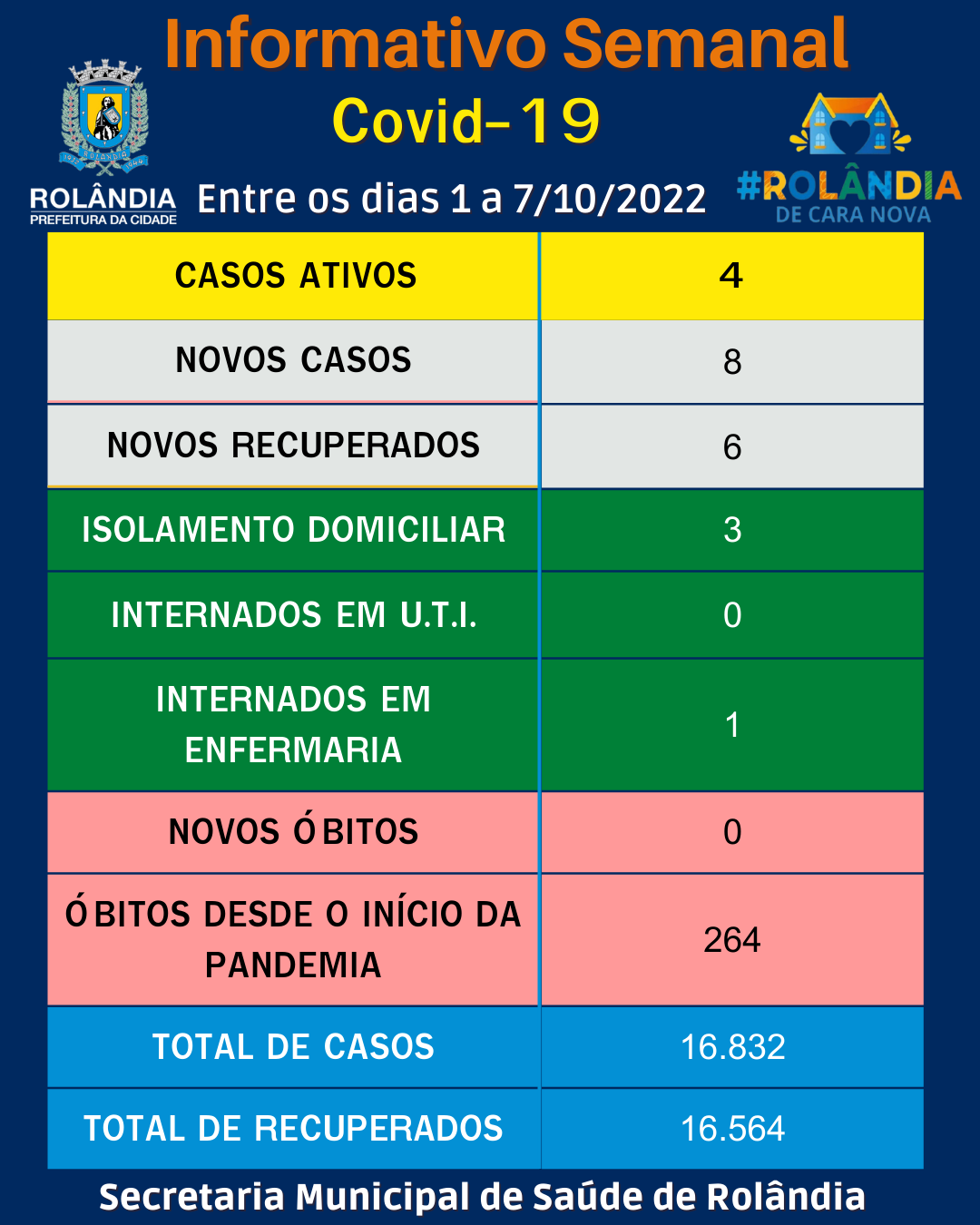 BOLETIM COVID-19 - 1 a 7 de outubro - 14h30A secretaria municipal de Saúde informa sobre os casos de covid-19. Na atualização do boletim semanal, oito contaminações e seis pacientes curados. Rolândia tem atualmente quatro pacientes com covid-...