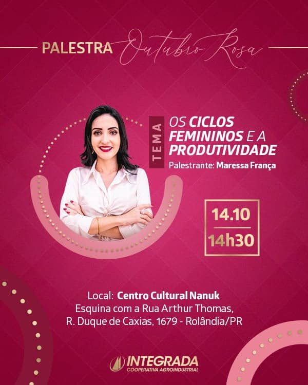 PALESTRA COM O TEMA "OS CICLOS FEMININOS E A PRODUTIVIDADE", DENTRO DA PROGRAMAÇÃO DO "OUTUBRO ROSA" Na sexta-feira, dia 14, a partir das 14h30, integrando a programação do "Outubro Rosa", da secretaria de Saúde, em parceria com a Cooperativa I...