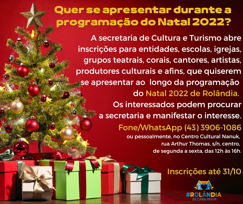 Quer se apresentar durante a programação do Natal 2022?A secretaria de Cultura e Turismo abre inscrições para entidades, escolas, igrejas, grupos teatrais, corais, cantores, artistas, produtores culturais e afins, que quiserem se apresentar ao lo...