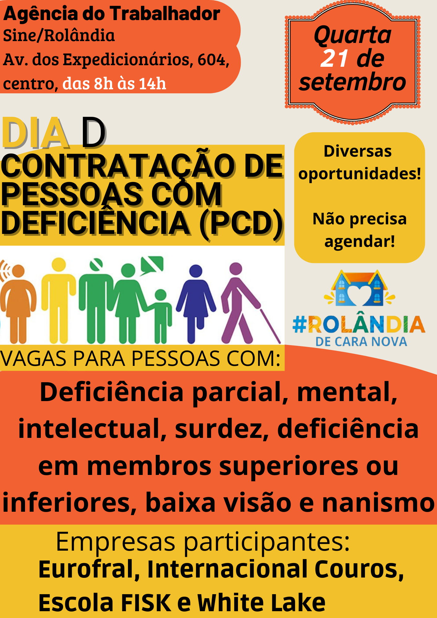 "DIA D" DE CONTRATAÇÃO DE PESSOAS COM DEFICIÊNCIAA secretaria de Desenvolvimento Econômico informa que, nesta quarta-feira, dia 21, das 8h às 14h, haverá também, na Agência do Trabalhador/Sine Rolândia, o "Dia D", para a contratação de Pes...