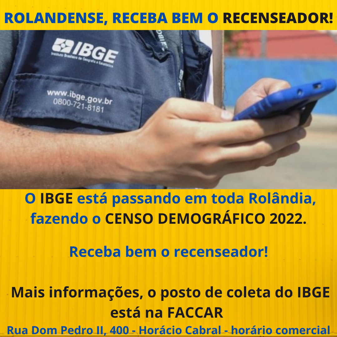 ROLANDENSE, RECEBA BEM O RECENSEADOR DO IBGE!Há cerca de 40 dias, Rolândia e todo o país convivem com os recenseadores do Instituto Brasileiro de Geografia e Estatística (IBGE), que deram início às entrevistas do Censo Demográfico 2022.Muitas ...