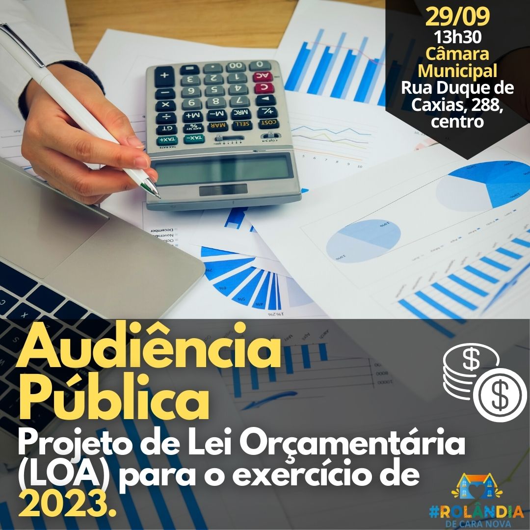 AUDIÊNCIA PÚBLICA DIA 29 VAI DISCUTIR A ELABORAÇÃO DO ORÇAMENTO DO MUNICÍPIO PARA 2023A Prefeitura Municipal de Rolândia, por meio da secretaria de Finanças, e a Câmara Municipal, por meio da Comissão de Orçamento, Tributação e Finanças...