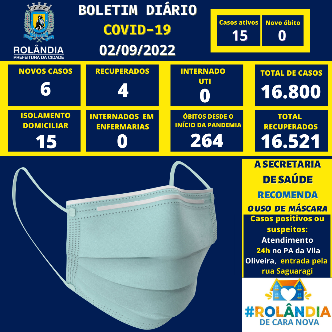 BOLETIM COVID-19 - 02.09.2022 - 16H45A secretaria municipal de Saúde informa sobre os casos de covid-19.Na atualização do boletim, seis contaminações e quatro pacientes curados.Rolândia tem atualmente 15 pacientes com covid-19, todos em isolame...