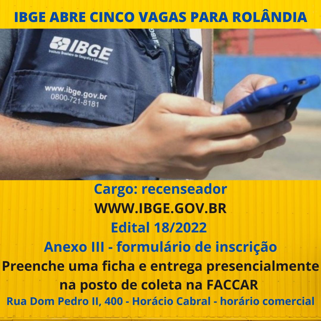 CENSO 2022IBGE ABRE CINCO VAGAS PARA ROLÂNDIA Cargo: recenseador WWW.IBGE.GOV.BREdital 18/2022 Anexo III - formulário de inscriçãoPreenche uma ficha e entrega presencialmente na posto de coleta na FACCAR Rua Dom Pedro II, 400 - Horácio Cabral ...