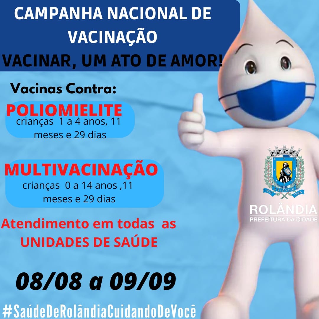 CAMPANHA DE VACINAÇÃO SEGUE ATÉ DIA 9A secretaria de Saúde informa que segue, em todas as Unidades Básicas de Saúde da cidade, a Campanha Nacional de Vacinação contra a poliomielite (para crianças menores de cinco anos) e Multivacinação pa...
