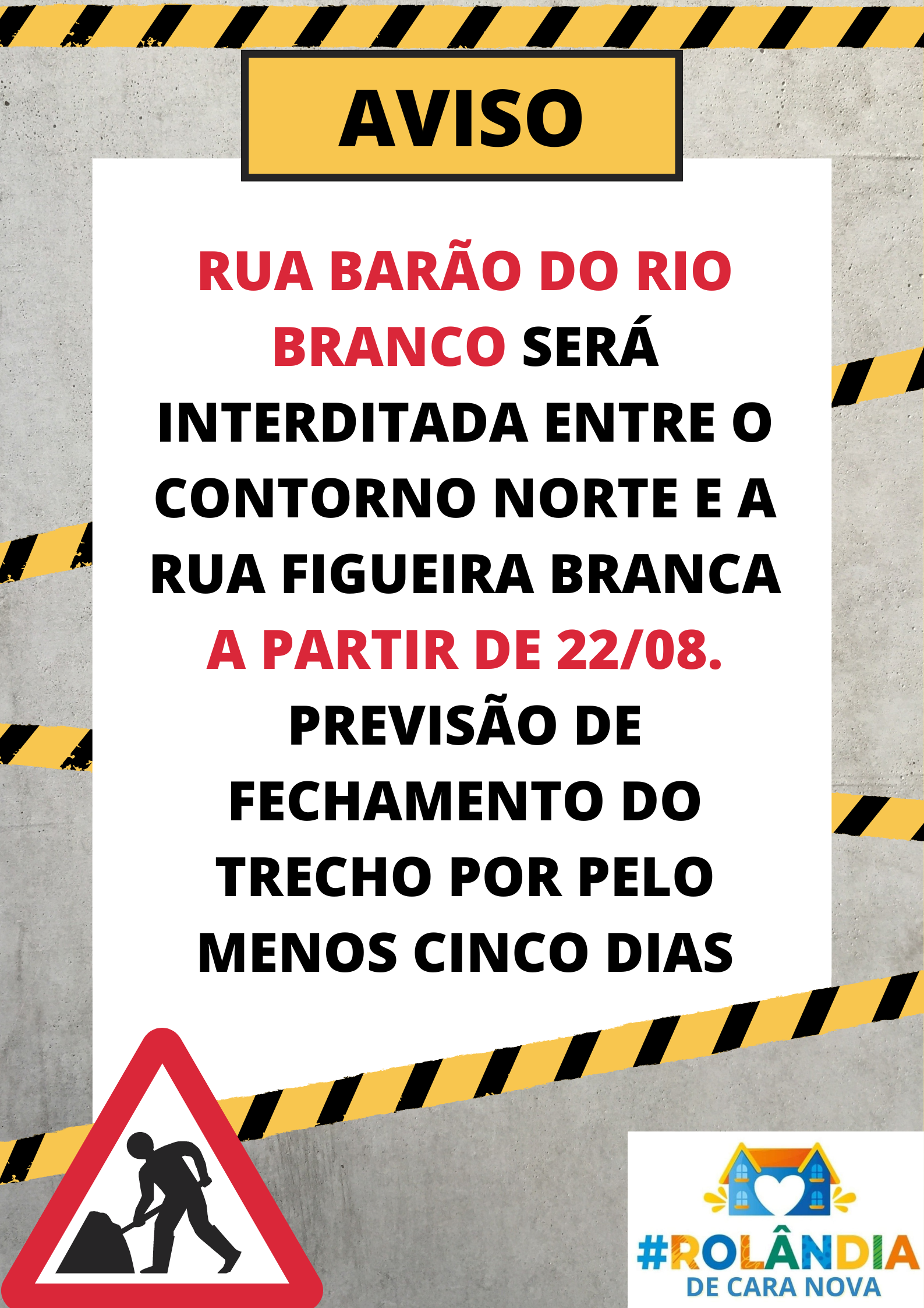 ATENÇÃO: INTERDIÇÃO DE TRECHO DA RUA BARÃO DO RIO BRANCO A PARTIR DESTA SEGUNDA-FEIRAAs secretarias de Infraestrutura e de Planejamento informam que a partir desta segunda-feira, dia 22 de agosto, um trecho da rua Barão do Rio Branco será inte...