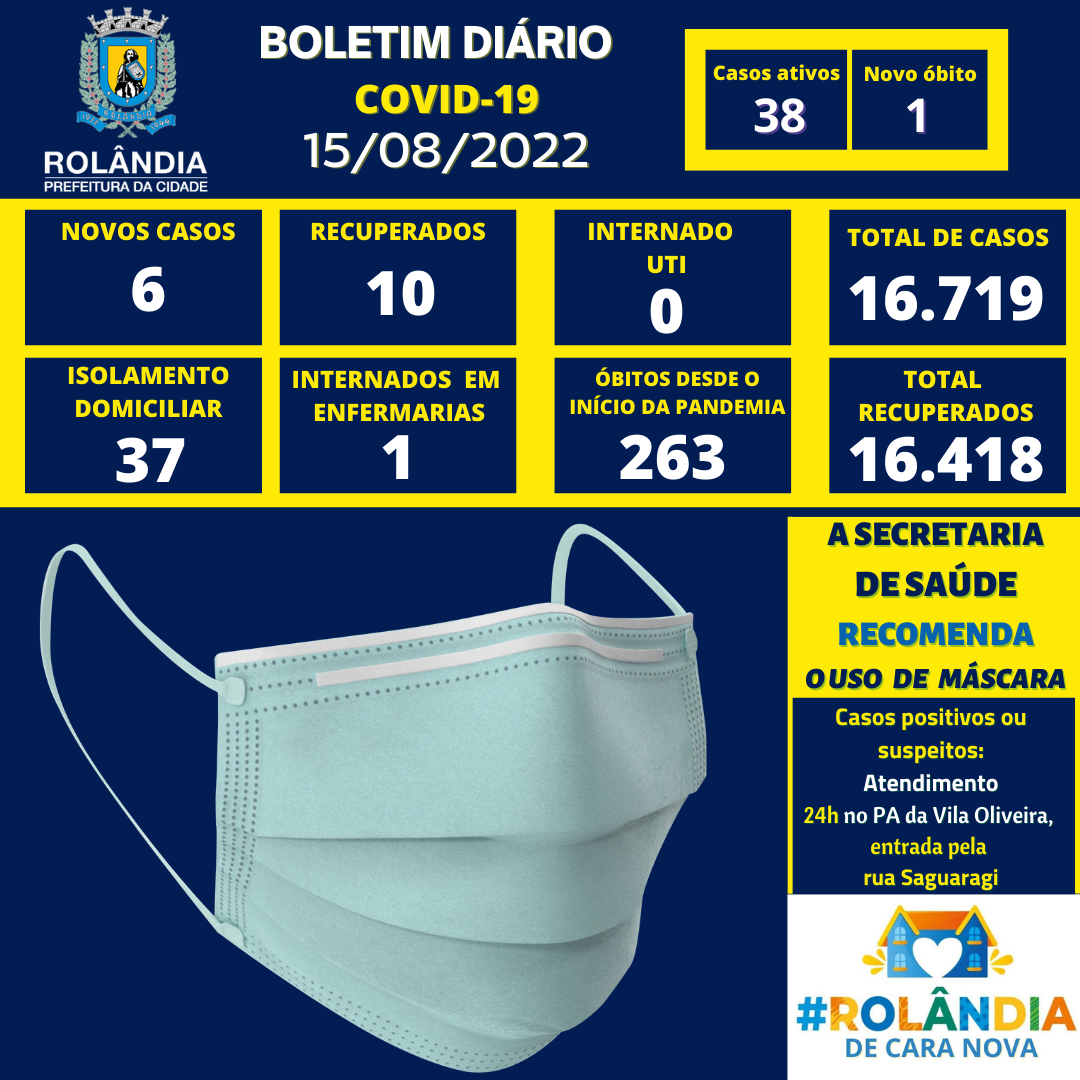 BOLETIM COVID-19 - 15.08.2022 - 16H15A secretaria municipal de Saúde informa sobre os casos de covid-19. Na atualização do boletim, seis contaminações e dez pacientes curados. Rolândia tem atualmente 38 pacientes com covid-19, sendo 37 em iso...