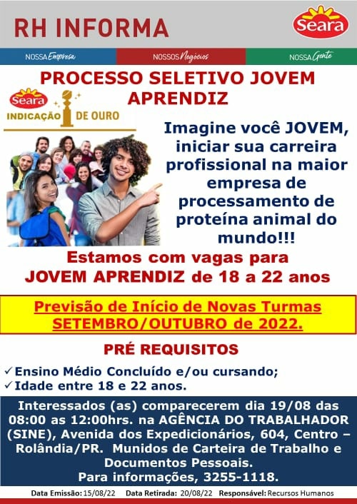Oportunidade para Jovem AprendizA secretaria de Desenvolvimento Econômico informa sobre oportunidade da Seara!...