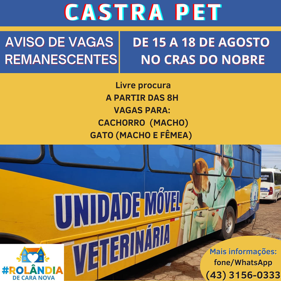 CASTRAPET - Vagas remanescentesA secretaria de Agricultura e Meio Ambiente informa que há vagas, por livre procura, a partir das 8h, em atendimento no Cras do Nobre - rua Ivaí.Por ordem de chegada/disponibilidade da vaga:15/08 Vagas disponíveis05 ...