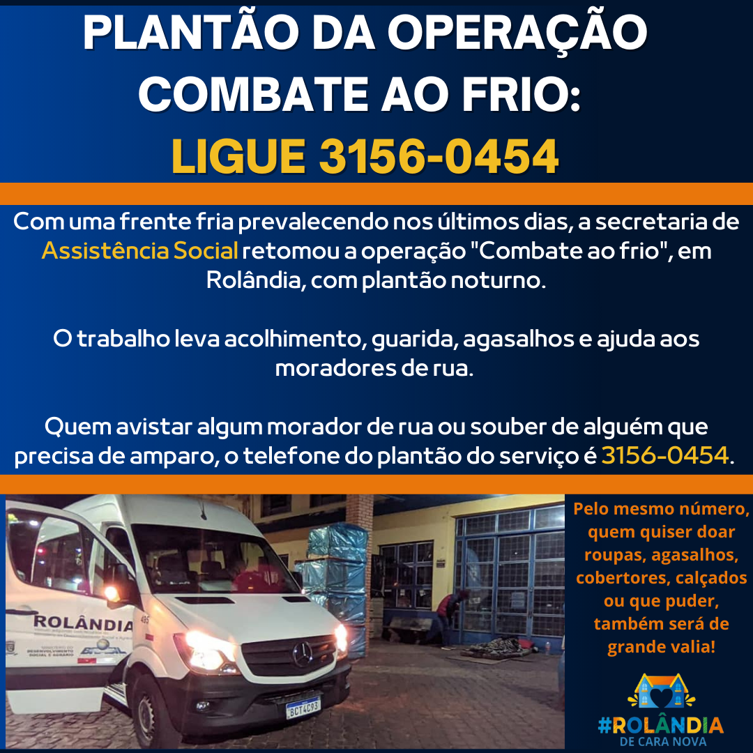 PLANTÃO DA OPERAÇÃO COMBATE AO FRIO: LIGUE 3156-0454Com uma frente fria prevalecendo nos últimos dias, a secretaria de Assistência Social retomou a operação "Combate ao frio", com plantão noturno. O trabalho leva acolhimento, guarida, agas...