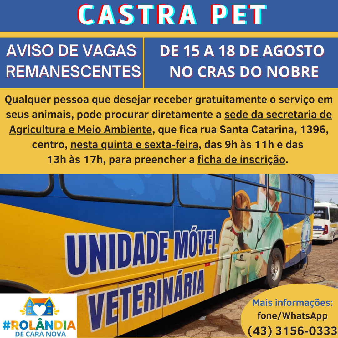 ÚLTIMAS VAGAS PARA O CASTRAPET EM ROLÂNDIAA secretaria de Agricultura e Meio Ambiente (SEMMA) informa que o segundo ciclo do Programa Permanente de Esterilização de Cães e Gatos (CastraPet Paraná), da Secretaria de Estado do Desenvolvimento Sus...