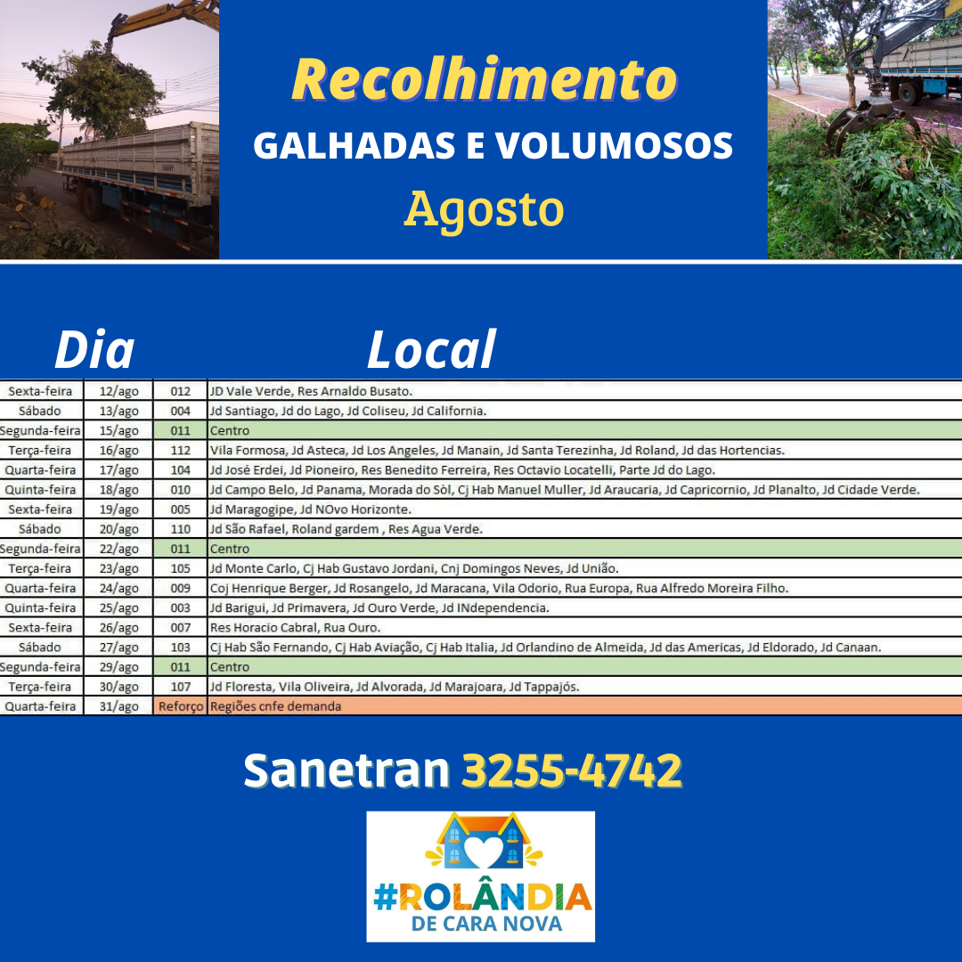 AGENDA DA SANETRAN PARA RECOLHER GALHADAS E VOLUMOSOSA Secretaria de Agricultura e Meio Ambiente informa que a empresa terceirizada que presta serviço ao município, a SANETRAN, dividiu a cidade em 14 regiões, sendo doze setores na área urbana e m...