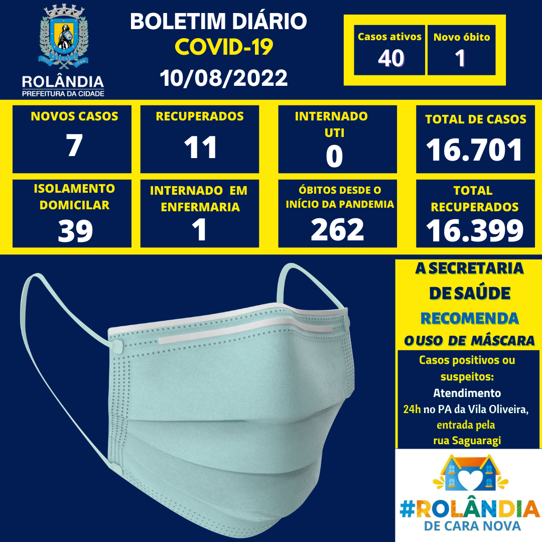 BOLETIM COVID-19 - 10.08.2022 - 14H45A secretaria municipal de Saúde informa sobre os casos de covid-19. Na atualização do boletim, 7 contaminações e 11 pacientes curados. Rolândia tem atualmente 40 pacientes com covid-19, sendo 39 em isolame...
