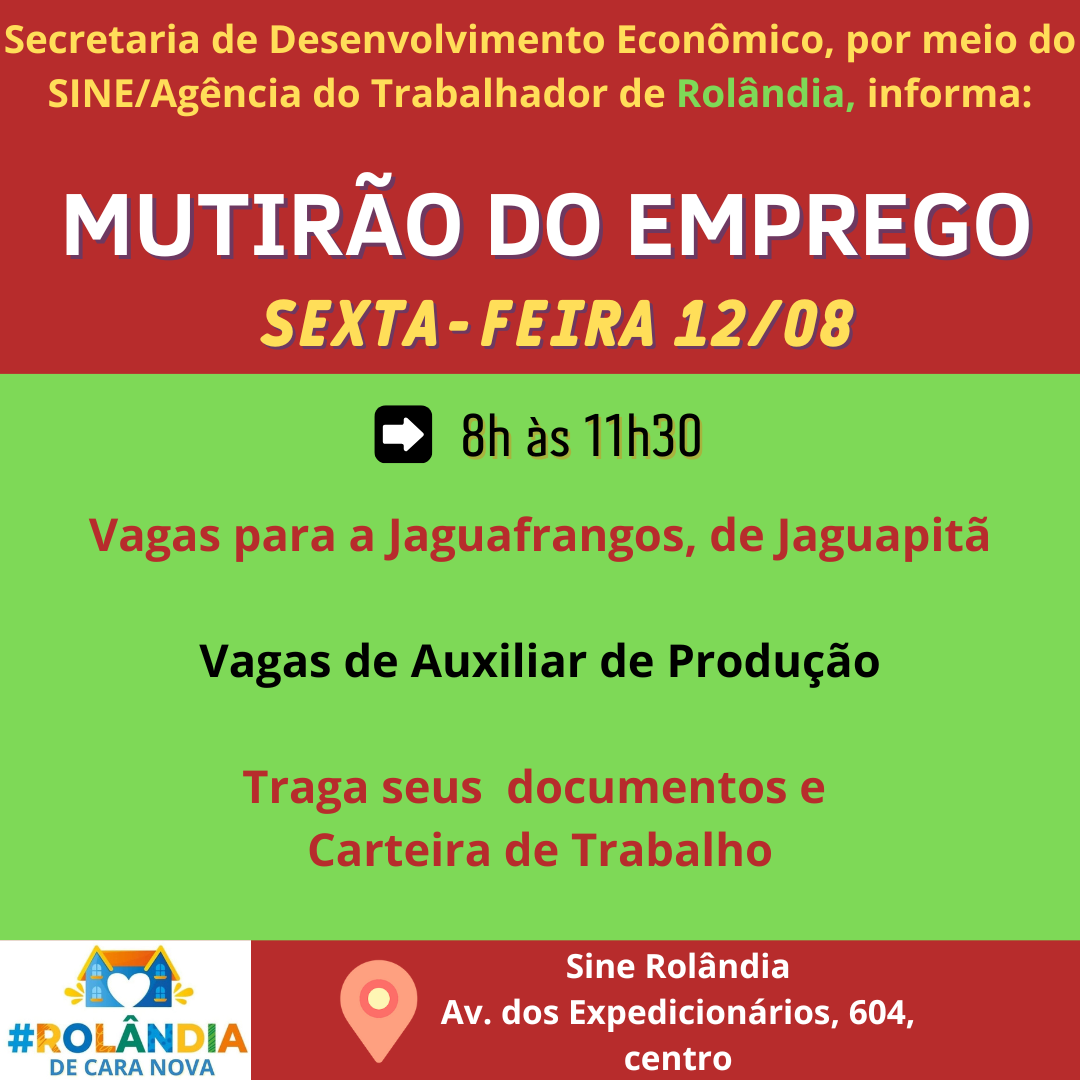 VAGAS DE EMPREGOA Agência do Trabalhador comunica que o atendimento acontece somente mediante agendamento pelo link http://Justica.pr.gov.br/trabalhoO funcionamento é das 8h às 14h, de segunda a sexta, na Avenida dos Expedicionários, 604, centro....