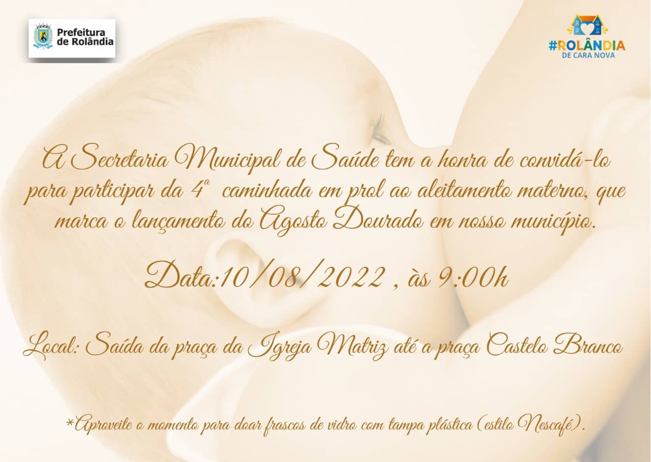 4º CAMINHADA EM PROL DO ALEITAMENTO MATERNO, NA QUARTA-FEIRA, DIA 10A secretaria municipal de Saúde promoverá a "4ª Caminhada em prol do Aleitamento Materno", uma das ações desenvolvidas em comemoração ao "Agosto Doutorado - Mês do Aleitam...