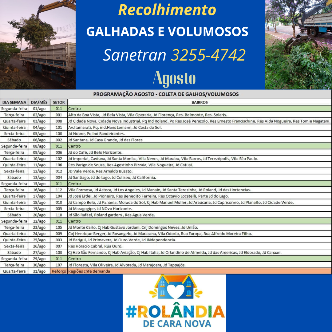 AGENDA DA SANETRAN PARA RECOLHER GALHADAS E VOLUMOSOSA Secretaria de Agricultura e Meio Ambiente informa que a empresa terceirizada que presta serviço ao município, a SANETRAN, divulga a programação do mês de agosto.Nas datas e locais destacados...
