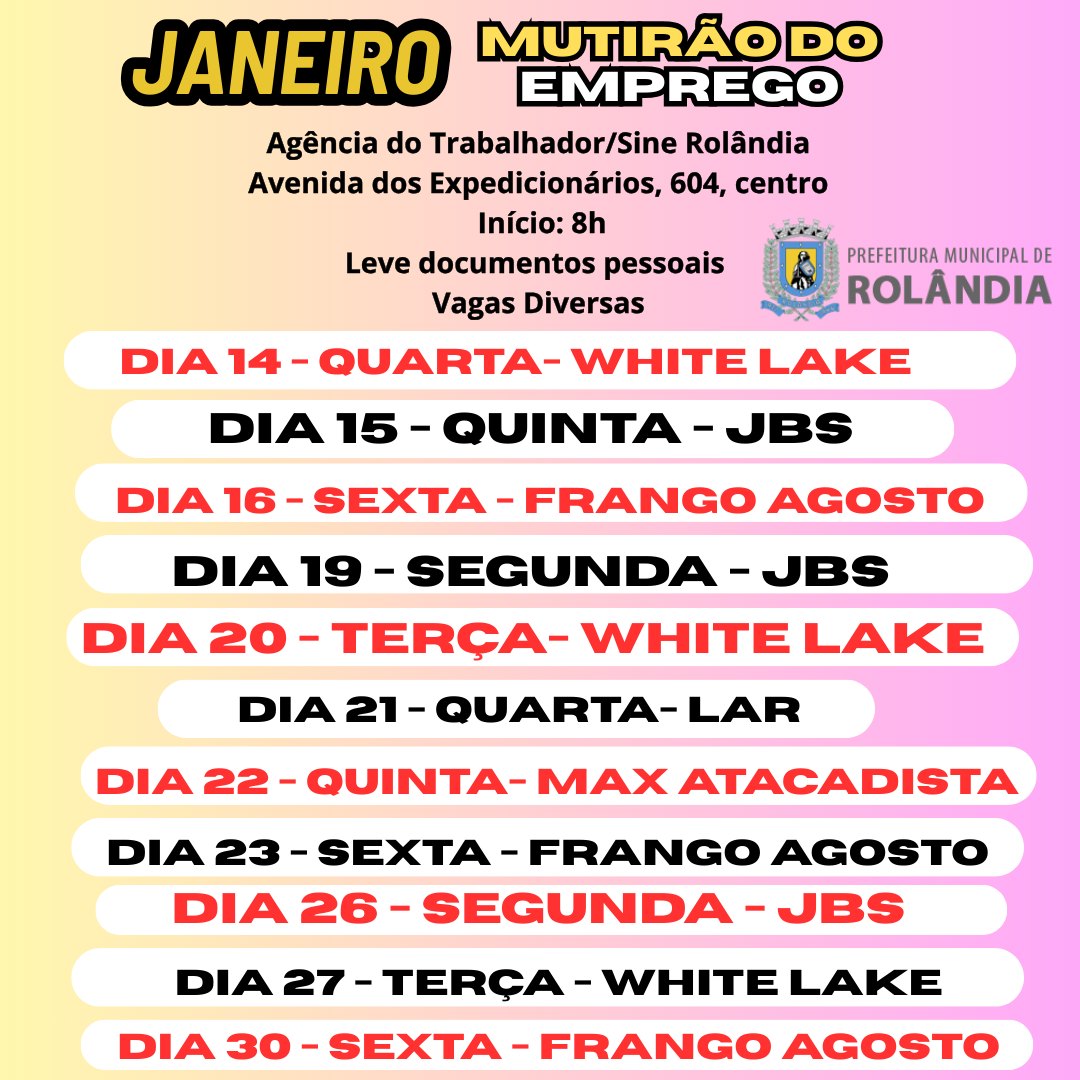 SINE Rolândia- vagas de emprego dia 14/01/2026 1. Agente de inspeção qualidade/SIF/JBS/SEARA 2. Ajudante de açougueiro/Mercado 3. Ajudante de carga e descarga 4. Ajudante de cozinha/JBS/SEARA 5. Ajudante de e...