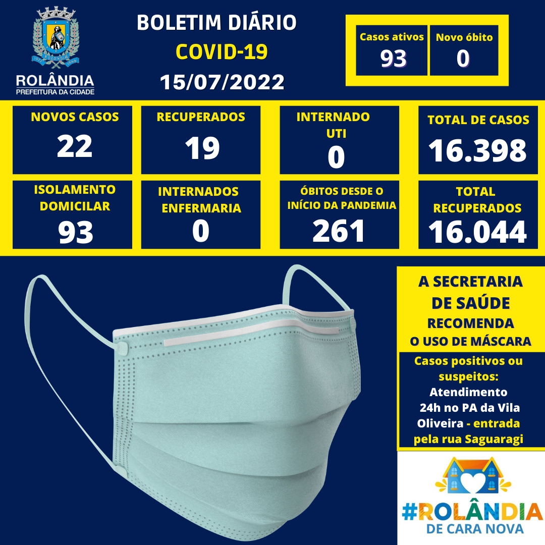 BOLETIM COVID-19 - 15.07.2022 - 14H05A secretaria municipal de Saúde informa sobre os casos de covid-19.Na atualização do boletim, 22 contaminações e 19 pacientes curados.Rolândia tem atualmente 93 pacientes com covid-19, todos em isolamento do...