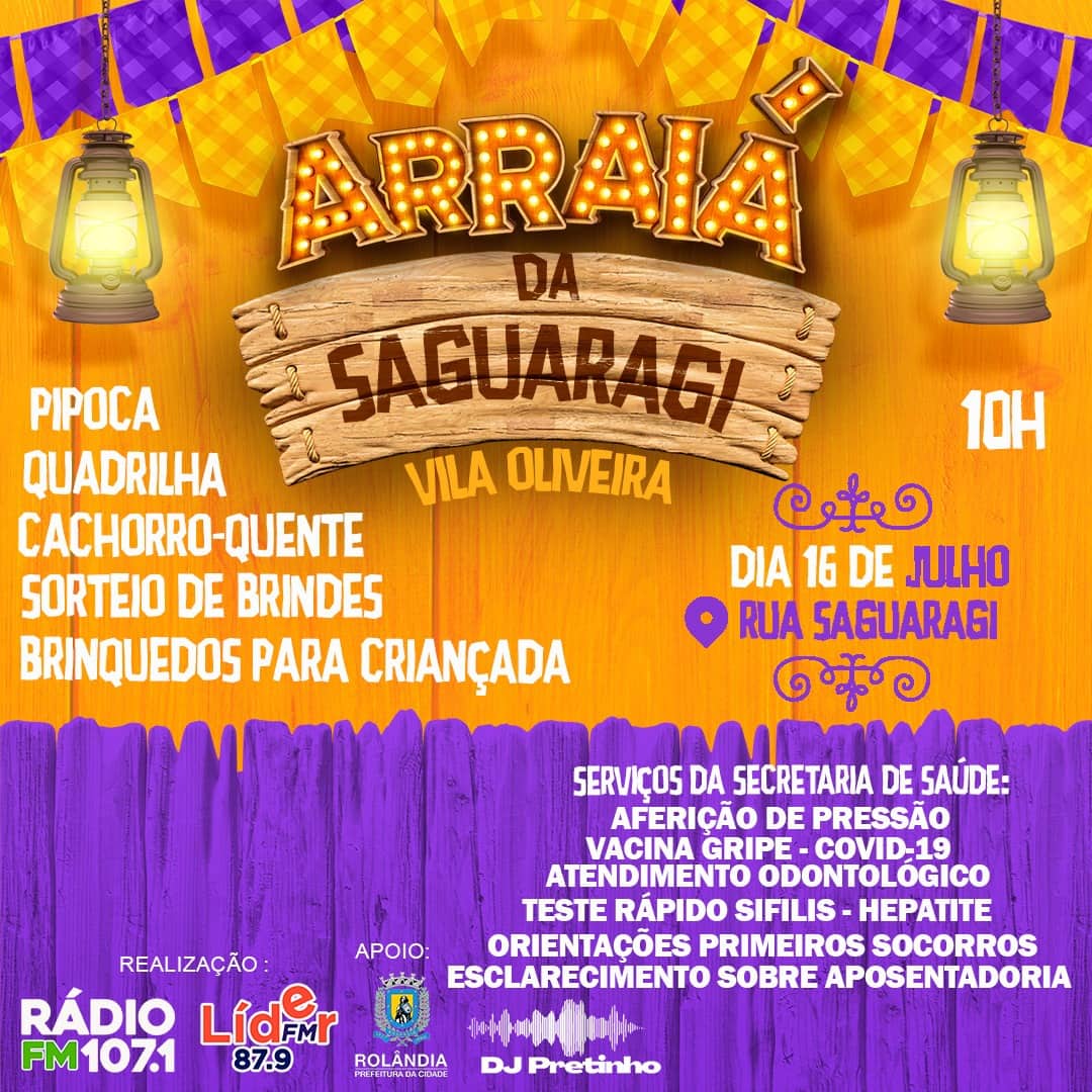 SECRETARIA DE SAÚDE PARTICIPA NESTE SÁBADO DO "ARRAIÁ DA SAGUARAGI"A secretaria de Saúde vai participar, neste sábado, dia 16 de julho, a partir das 10h, do "Arraiá da Saguaragi", evento promovido pelas rádios 107,1 FM e Líder 87.9 FM, na ru...