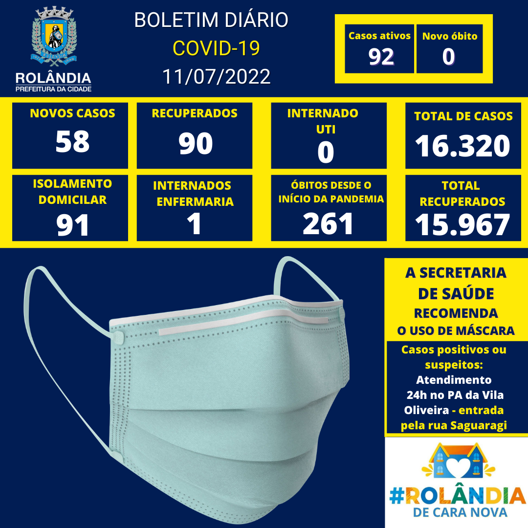 BOLETIM COVID-19 - 11.07.2022 - 16H15A secretaria municipal de Saúde informa sobre os casos de covid-19. Na atualização do boletim, 58 contaminações e 90 pacientes curados. Rolândia tem atualmente 91 pacientes com covid-19, sendo 90 em isolam...