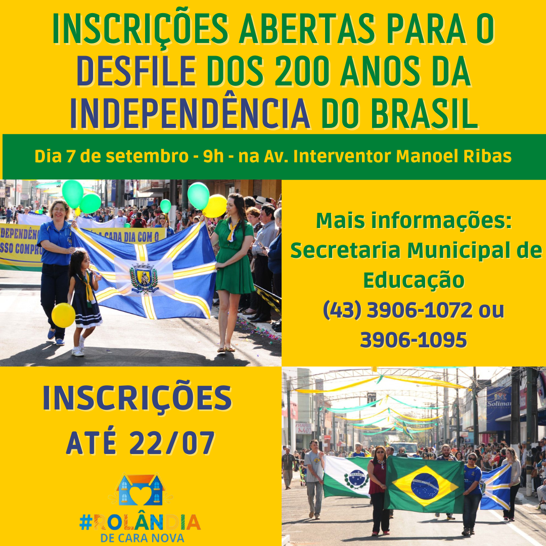 ABERTAS AS INSCRIÇÕES PARA A SEMANA DA PÁTRIA E DESFILE CÍVICO EM ROLÂNDIAA Prefeitura de Rolândia, por meio da Secretaria Municipal de Educação, está com inscrições abertas para as instituições, organizações e entidades que desejam pa...