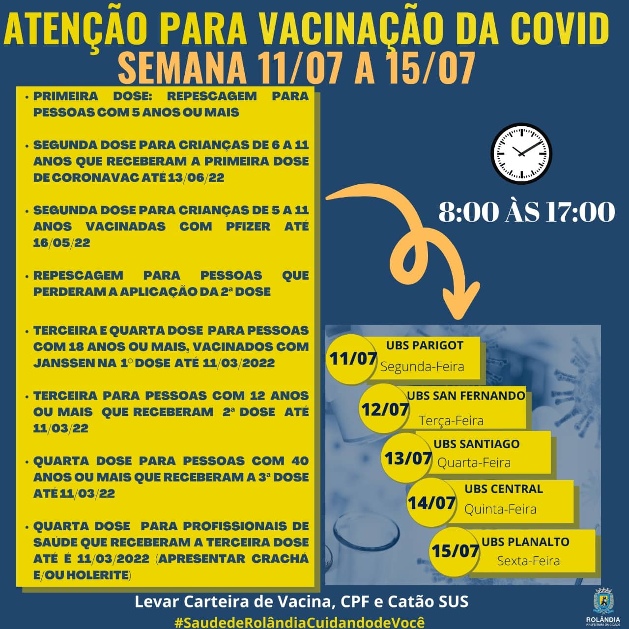 AGENDA SEMANAL VACINAÇÃO CONTRA A COVID-19Entre os dias 11 a 15 de julho...