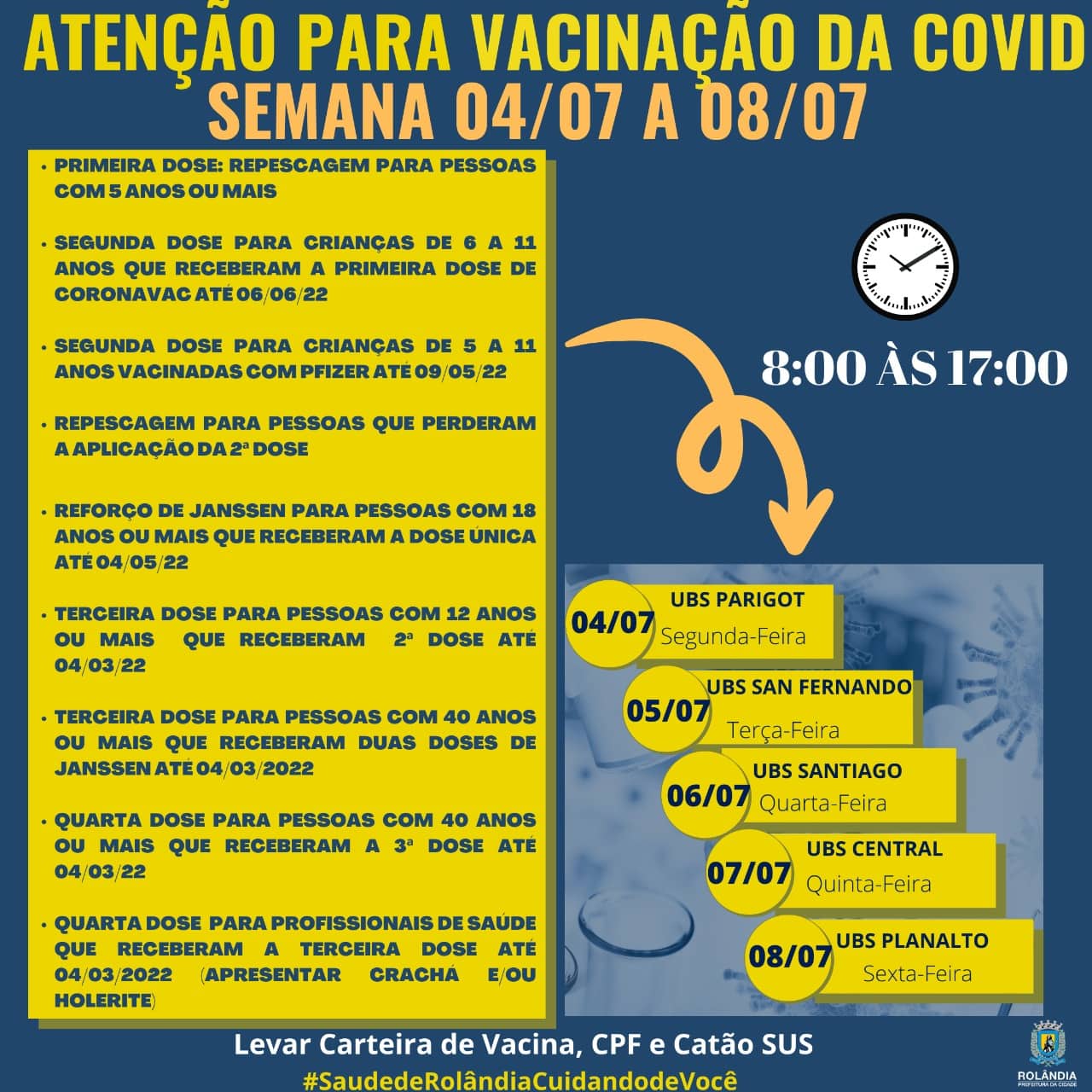 AGENDA SEMANAL VACINAÇÃO CONTRA A COVID-19Entre os dias 4 a 8 de julho...