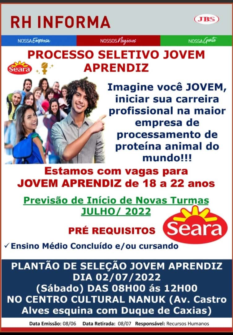 VOCÊ TEM ENTRE 18 E 22 ANOS E DESEJA SER APRENDIZ NA SEARA?VENHA NESTE SÁBADO DE MANHÃ NO NANUK!...