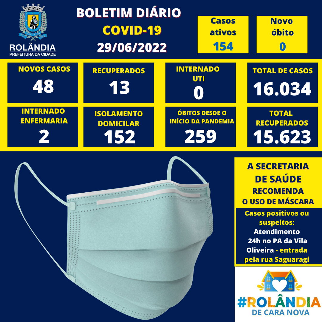 BOLETIM COVID-19 - 29.06.2022 - 15h20A secretaria municipal de Saúde informa sobre os casos de covid-19. Na atualização do boletim, 48 contaminações e 13 pacientes curados. Rolândia tem atualmente 154 pacientes com covid-19, sendo 152 em isol...