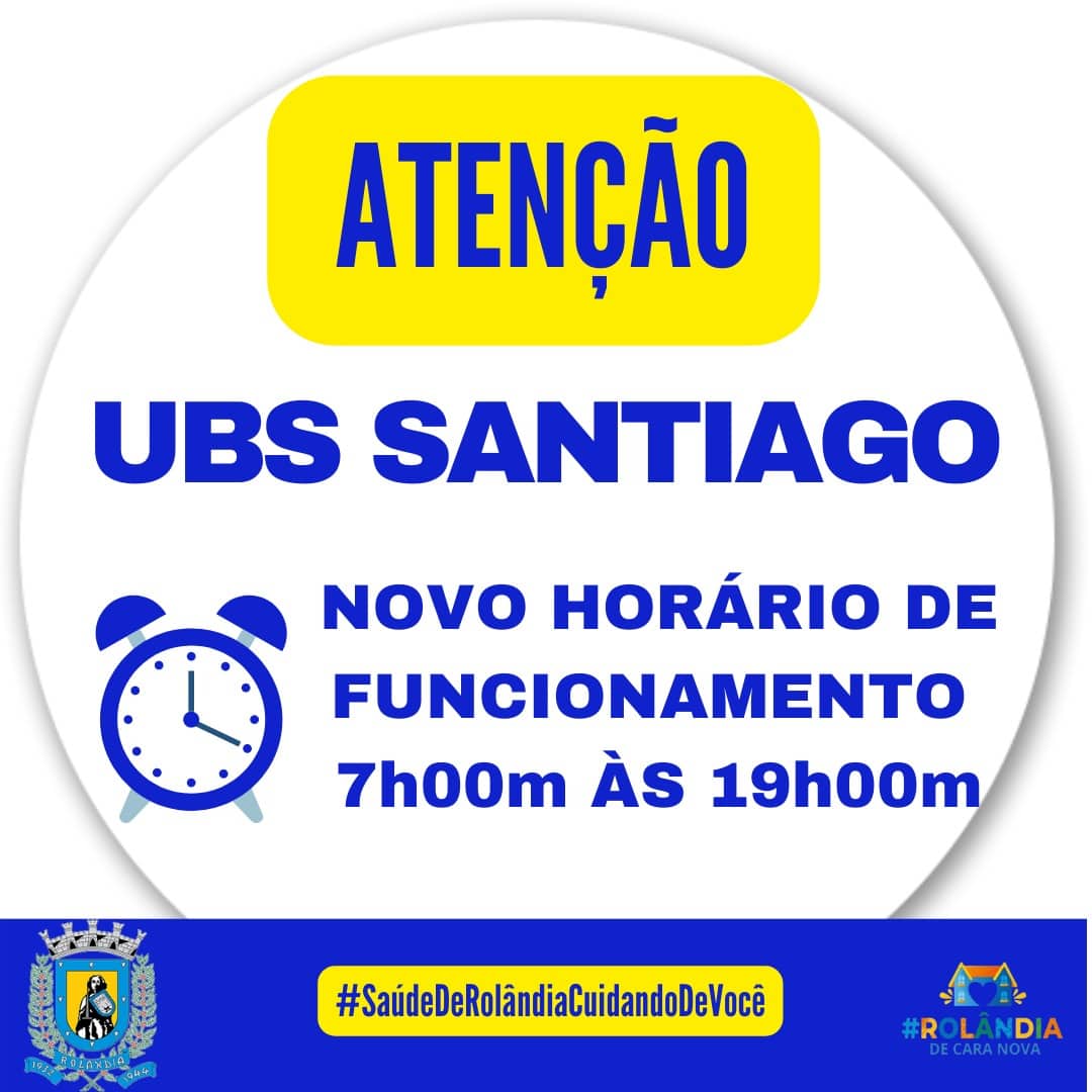 AMPLIAÇÃO DO HORÁRIO DE FUNCIONAMENTO DA UBS SANTIAGOA secretaria de Saúde informa que partir desta segunda-feira, dia seis de junho, a UBS Santiago vai atender até às 19 horas e com reforço na escala médica.O aumento no horário de atendimen...